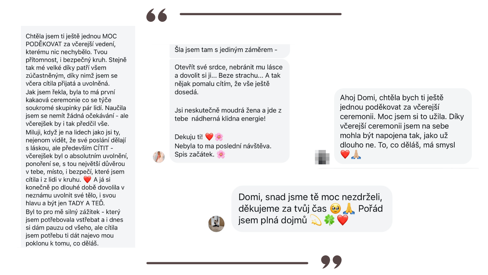 Ceremonie vytváří bezpečný prostor, ve kterém se můžeš na chvíli odpojit od okolního světa – a s podporou kakaa, hudby a jemného vedení se ponořit do kontaktu se svým nitrem.
